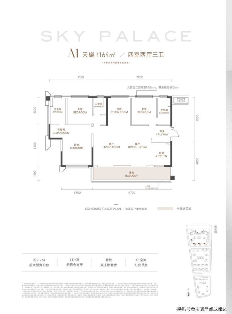 约9.7M超奢阳台,极致观景视野;LDKB一体化会客厅,社交、聚会生活场;墅级双主卧套房,尽显主人生活品位;独立灵动书房空间,栖息身心的理想国