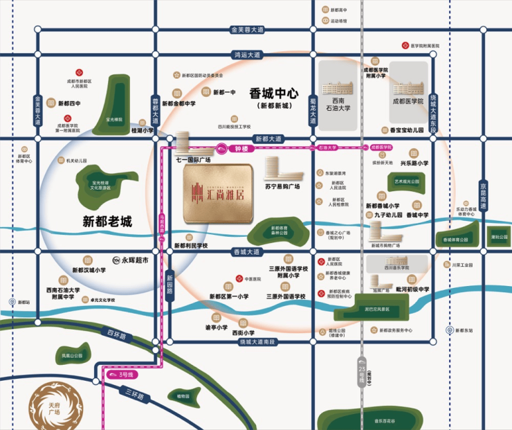 教育资源:周边形成0-18岁全龄教育体系,包括香宝宝幼儿园、医学院附属小学、规划中的新都高中,以及石油大学、医学院、音乐学院等高等院校。