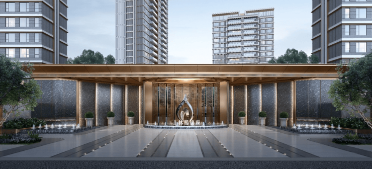 酒店式入户大堂,以香槟金铝板与玻璃幕墙构筑建筑美学标杆