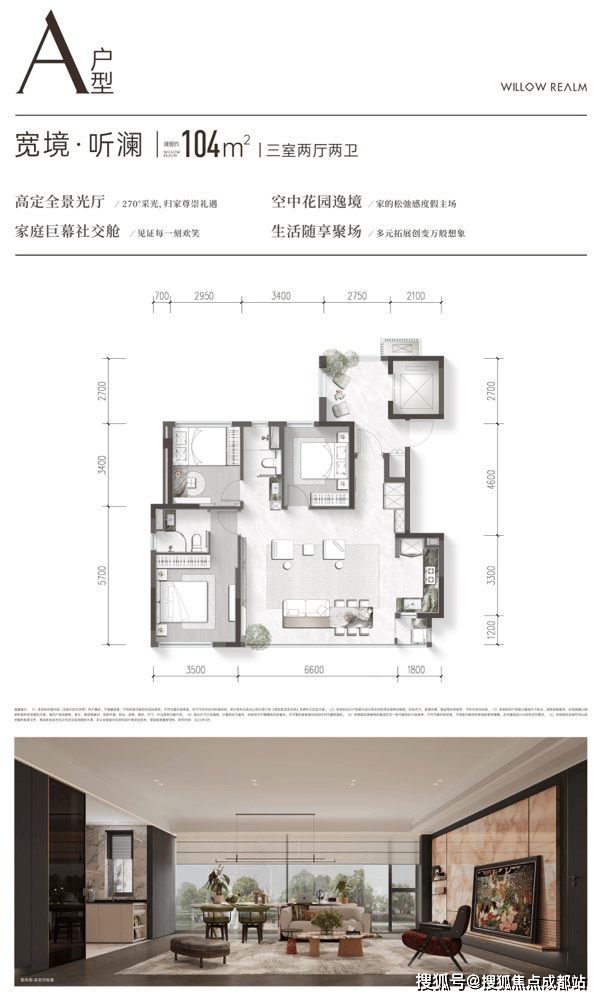 主力户型104-143㎡现代阔景平层,标准层高3.05米(商业底层除外),专属电梯厅入户设计
