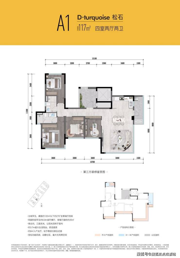 厨房270°环幕采光,15㎡巨型光厅入户,四叶草布局动静分区合理,得房率超104%。
