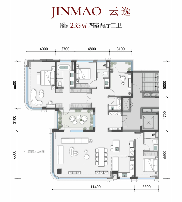 金茂璞逸锦江是中国金茂“璞系”产品在西南地区的首个落地项目,定位为金融城东高端豪宅标杆。项目由成都志茂置业有限公司开发,占地约52亩,容积率2.5,绿地率35%,规划9栋18-25层高层住宅,共386户,主打198-235㎡大平层,全精装交付,层高3.15米,预计2027年3月交房。