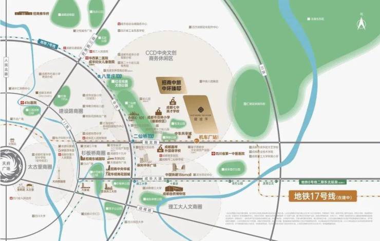 立体交通网络:项目与在建地铁17号线机车厂站相距仅约200米,1.5公里辐射圈内还覆盖地铁7号线、8号线。中环路、三环路、蜀龙路、成华大道等城市主干道纵横交错,构筑起多维立体的交通体系,确保出行便捷高效。