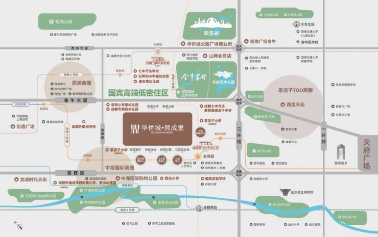 教育:幼儿园:成都四幼文创园区、京师小学堂成都国际幼儿园、金牛机关二幼小学:茶店子小学金樽校区、迎宾路小;中学:成都外国语学校、成都七中、金牛中学