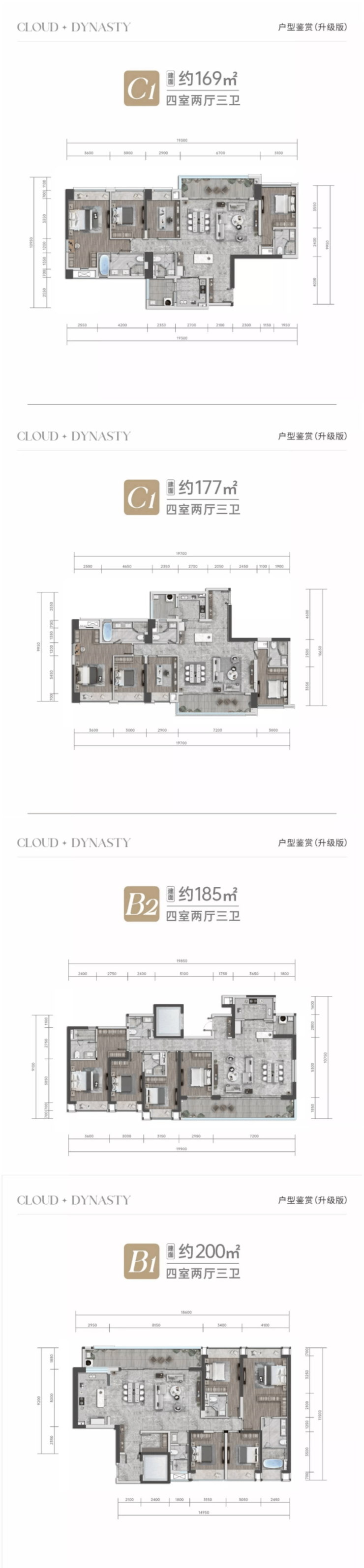 建面169-297㎡的大平层户型,空间宽敞,布局合理,能够满足改善型家庭的居住需求。客厅、卧室等主要功能区面积较大,采光和通风良好,居住舒适度高。部分户型带有独立的书房、衣帽间等,功能齐全。