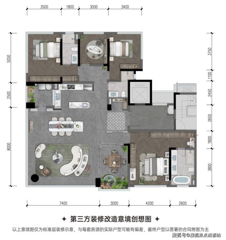 四室两厅两卫,独立电梯厅入户;7米客厅面宽,动静分区;赠送空中院落。