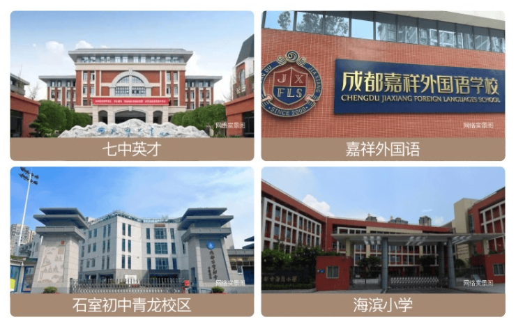 全优名校:七中英才、嘉祥外国语、第十二幼儿园、海滨小学、北新实验小学、成都市实验中学、石室初中青龙校区等。