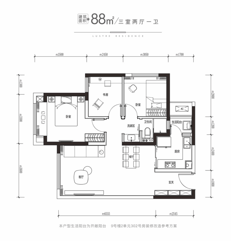 88平三室刚需绝版小户(总高26层,3梯6户)总价150万起