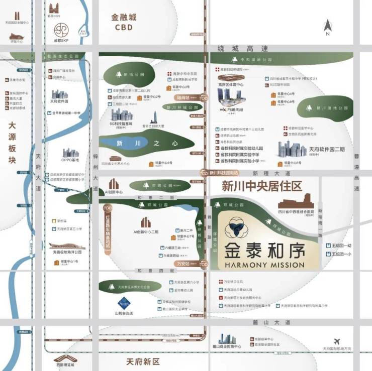 从位置来说,金泰和序择址的新川南,上承高新,下接天新,是近年来高新乃至城南大力发展区域。新川相较高新其它板块有着更磅礴的规划,其打造逻辑就是以“产城”为基底,随着天府软件园二期(待建)、AI创新中心等多个重量级产业的落地,吸金指数和造富能力日益强劲,已迎来区域爆发期。十年发展,早期开发的新川北侧已趋于饱和,南侧则有着较多的住宅用地储备,未来潜力无限。