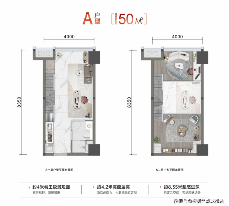 理念项目主打建面约50 - 80㎡的跃变公馆,约4.2米的层高是其最大亮点。这样的设计为空间赋予了极致的灵活性与舒适感,能够充分满足年轻人多元化的生活与工作需求。户型设计着重强调空间的多功能性,约4米开间、8.35米进深的格局,实现了大面宽、大场景的享受型标准。居住、社交、办公、创业、兴趣孵化等多元场景可自由切换,能够同时满足“生活家”与“创业家”的双重需求。户型详解