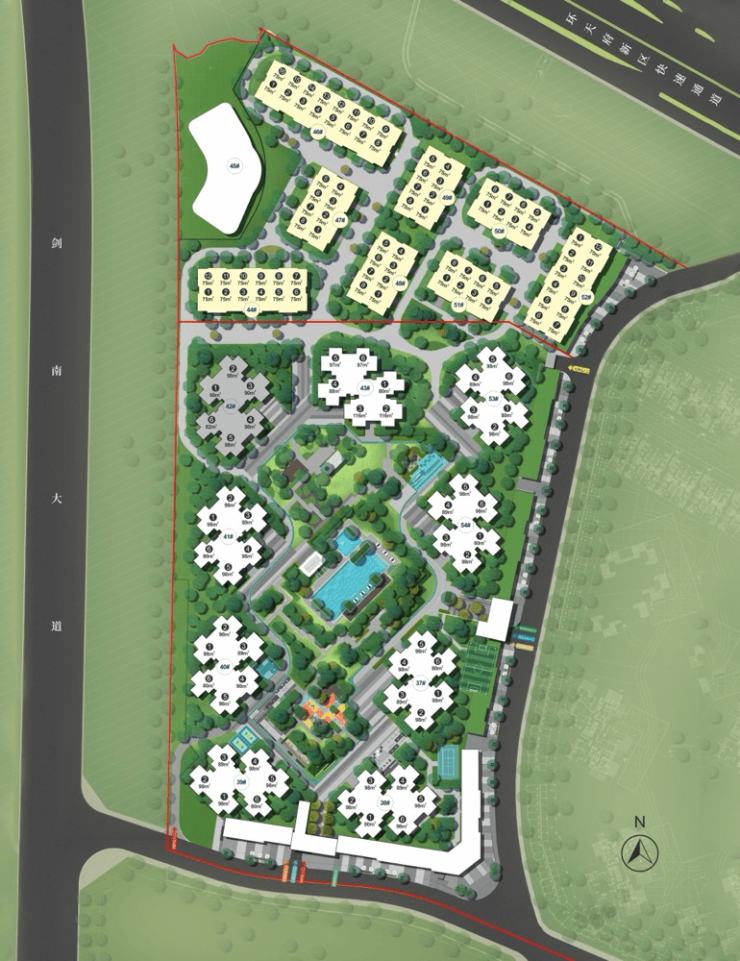 区域路网:五横四纵立体交通网络快速通达全城,剑南大道30分钟北达成都城区,南至眉山市,环天府快速通道,直通通达西至双流国际机场,东至天府国际机场