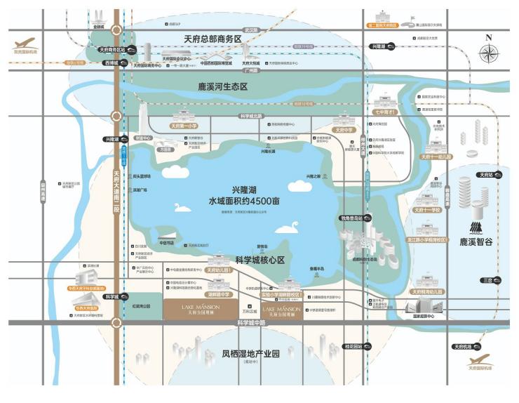 约4500亩兴隆湖,是国内唯一座符合“欧洲蓝”标准的公园湖;(数据来源兴隆街道官方数据);约4500亩鹿溪河生态公园;(数据来源搜狗百科);约3450亩天府中央公园,享受城市最宜居的顶配生态资源。(数据来源百度百科)