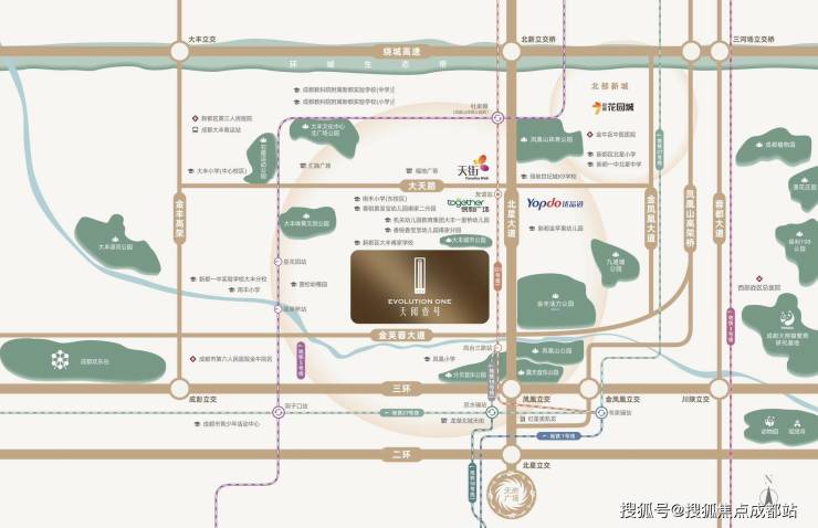 项目扼守北星大道与金芙蓉大道交汇处,作为凤凰山板块门户,兼具政务商务双重属性。东侧毗邻新都医贸大厦(年税收超亿写字楼),北靠四川省公安厅在建办公区,365亩金丰活力公园举步可达。六大公园环伺形成天然氧吧,奠定城北生态住区典范地位。