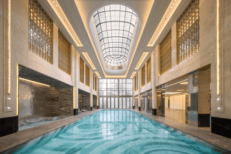 项目复刻其经典装饰主义,约10.5m挑高大堂,挑空拱门架构的恒温泳池、孔雀廊般的艺术展廊,层叠线条,艺术家真品装置等,让峯层生活从此同频华尔道夫
