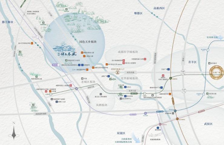 项目位于成都西贵之地温江,距离成都主城区约15公里,交通便捷,地铁4号线与主城区无缝连接,地铁17号线、19号线贯通城区。项目所处国色天乡板块,位于温江核心区域,集生态、文化、旅游于一体,兼具城市繁华与自然静谧,是理想居住与投资之地。
