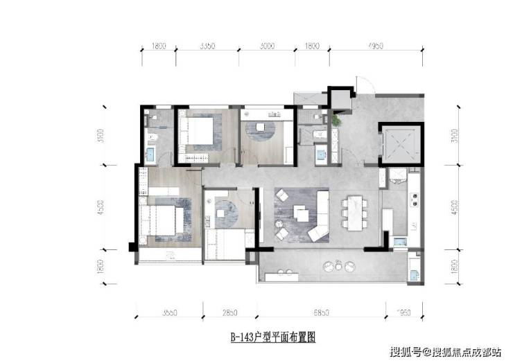 户型方正,空间布局合理,动静分区明确。客厅与餐厅相连,形成宽敞的活动空间,外接观景阳台,可欣赏到公园或小区内部景观。三间卧室分布合理,保证了家庭成员的私密性,主卧带有独立卫生间,方便使用。