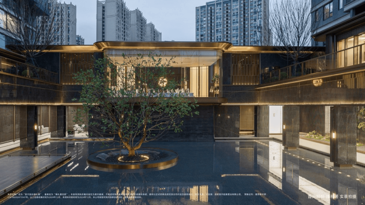 沉式庭院泛会所:纳自然之形,造天空之境,以流水庭院演绎高奢气质。以枯山水造景,流动的瀑帘与水中的乌桕,营造出“虽在人境,心见远山”的意境,将山水诗意融入隐奢都市生活。