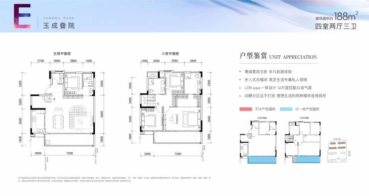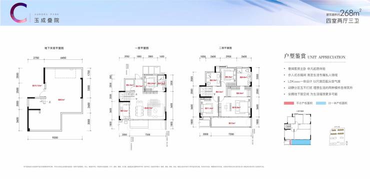 面积:上叠188m² (带屋顶花园90m²);中叠188m²;下叠268m²(花园100m²)