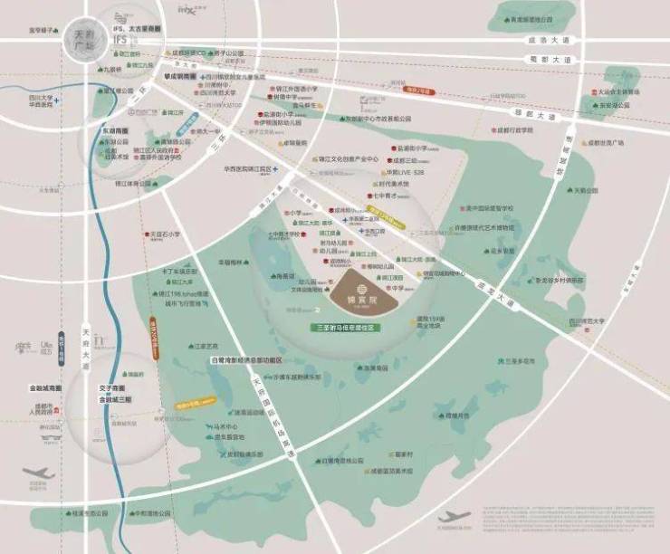 驸马板块西侧与南侧无缝衔接15000亩三圣乡生态绿海,东侧直面约3公里绿湾半岛景观带,形成"城市界面+生态资源"的双重占位优势。这种"绿洲中的半岛"格局,既承接了金融城-林家坝的东进势能,又延续了太古里—东大街商圈的繁华脉络,成为主城罕见的"黄金三角"区位。