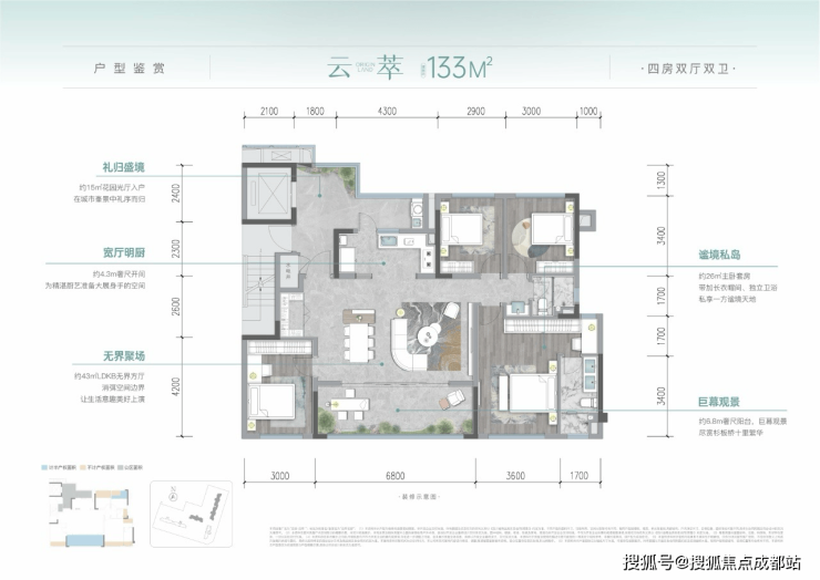 超阔空间:建面约112㎡享超配4房大方厅,采用LDKB一体化设计,消弭空间界限,演绎生活丰盈场景,巧妙打通书房空间,双阳台对望室内更加通透;建面约133㎡享4房大双厅奢阔主卧,幻变空间可做书房、棋牌室,满足家庭全生命周期情景所需。