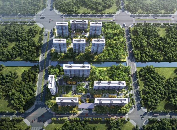 项目分立河流两侧,景观生态资源优质,低建筑密度,突破传统的阵列式布局,打造片区独有的超大中庭花园。内外双园出门皆是绿意。