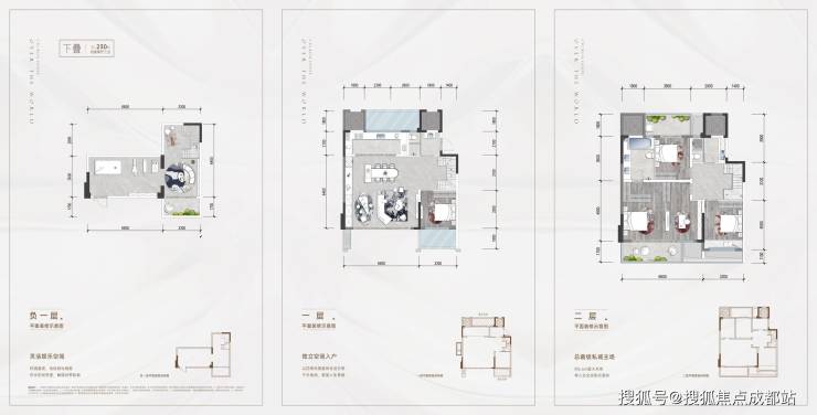 以建面约230㎡下叠户型为例,南向9.9m面宽,三开间朝南。三面宽是豪华级叠拼硬性要求。与常见的老人房北置不同,我们下叠的老人房朝南摆放,这种摆法让客餐厅形成约42㎡的方厅。这个方厅的好处是进深够大,容纳客厅和餐厅功能的同时,还能开辟一个多功能厅。