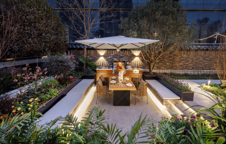 下叠单元配备精装入户花园,以"一院九境"为设计蓝本。通过乔灌草立体种植,营造可游可赏的沉浸式园林体验。紫薇廊架、果木飘香、石径通幽,再现《园冶》造境精髓。