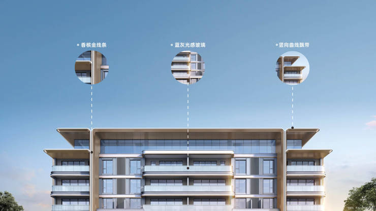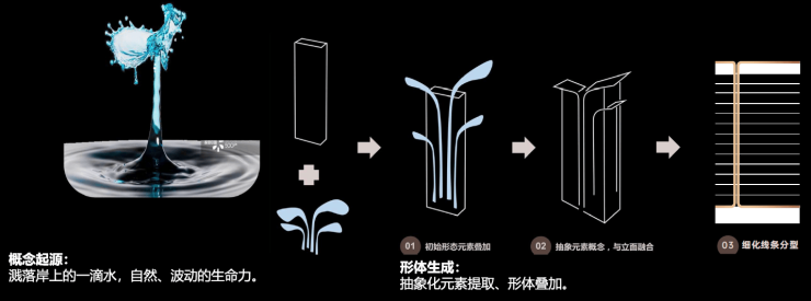 以滴水流体塑性为灵感,延续臻系建筑立面美学,以“锦水曲线”为灵感,形成极具韵律的曲线瀑布造型。在颜色萃取上,从蜀锦正色中提取元素,通过香槟、中灰、米白的搭配,营造出一种跟随自然的律动。