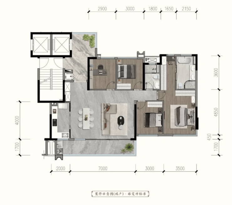 采用高标准精装修交付,从建材到工艺均选用优质一线品牌。以建面约188m户型为例,在精装配置上实现了全面进阶