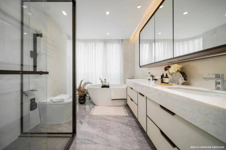 人性化细节设计:厨房独立空调系统确保烹饪环境舒适,零冷水系统与末端净水装置保障用水安全便捷;卫浴区域标配电热毛巾架与化妆品专用冰箱,镜柜集成储物与照明功能,细节之处彰显人文关怀。