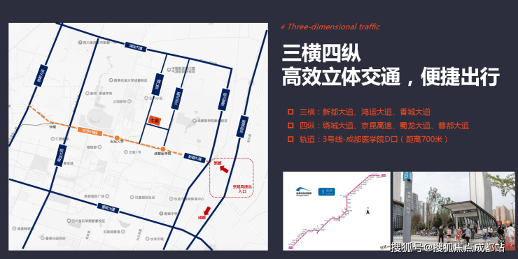 项目交通:三横四纵立体交通网,三横:鸿运大道、新都大道和香城大道,四纵:蓉都大道、蜀龙大道、绕城大道、京昆高速,北去往青白江,往南半小时到达动物园,连接杉板桥、建设路核心区域商圈