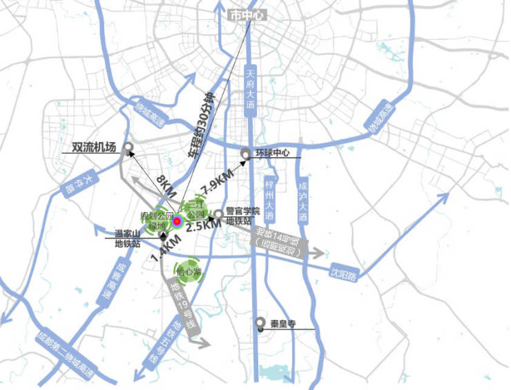 双轨交汇:地铁19号线(温江山站1.4km)、5号线(警官学院站2.3km)