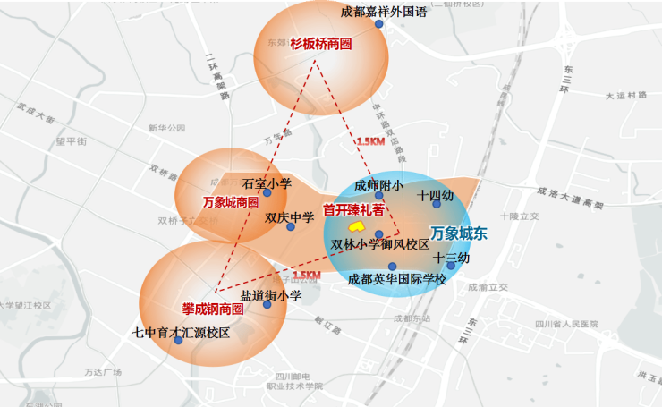 万象城东与万象城商圈、攀成钢商圈、杉板桥商圈三大高端商圈共同构成东二环的“黄金三角”区,已形成媲美金融城商圈的潮流文化引领地,也将是城东高端生活居住区的首选地。