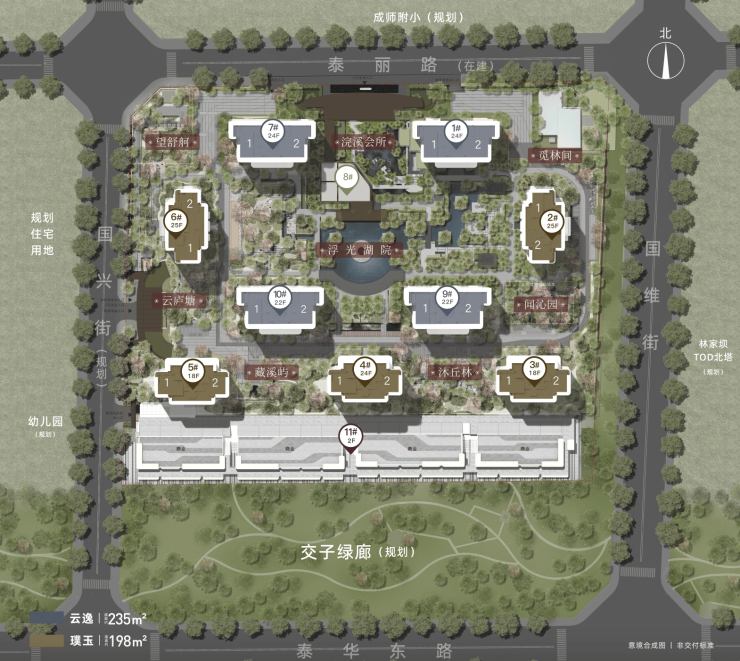 社区规划:首层全架空设计打造9大泛会所(亲子、健身等主题),中央浮光湖岛+六大庭院构建五进式归家礼序。