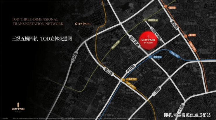 四轨:27号线(花照壁北,约600米)、地铁6号线(金府站,约1公里)、7号线(茶店子站,约800米)、地铁2号线环绕