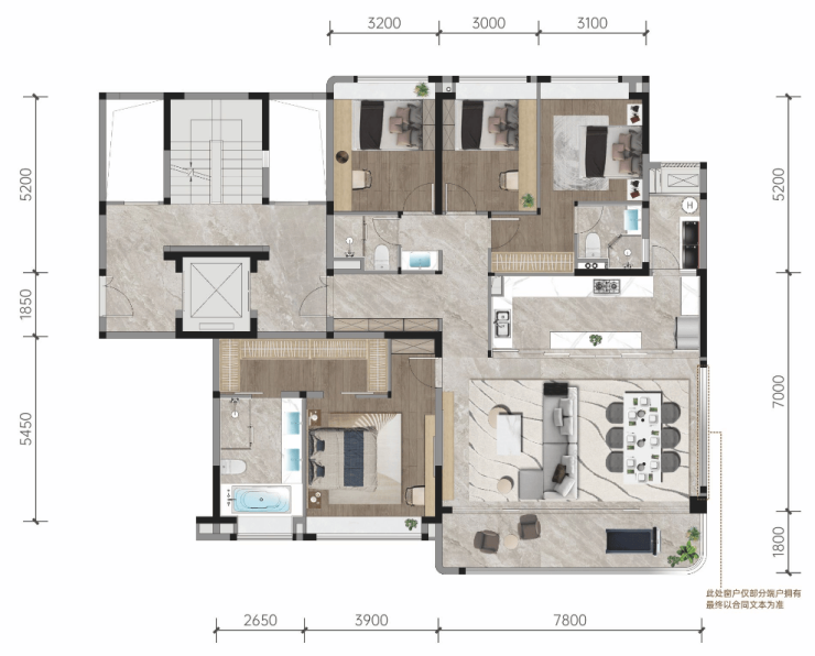 199㎡户型:约60㎡的行政级主卧系统;约10米巨幕阳台