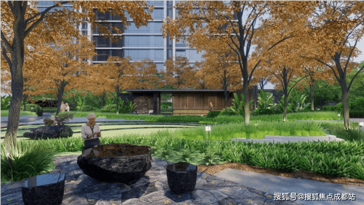 主入口对景水院,采用“自然系”主题雕塑与浑然天成的景致湖滩,同时以天然石块、片岩结合下沉卡座,打造约300㎡曲水流觞逸境。