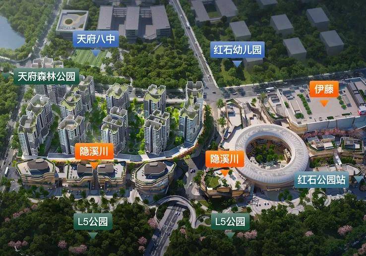 生态:项目北侧是约590亩的天府森林公园,西侧紧靠约2.3万平方米的L5活力公园。南侧约10万平方米的红石公园。