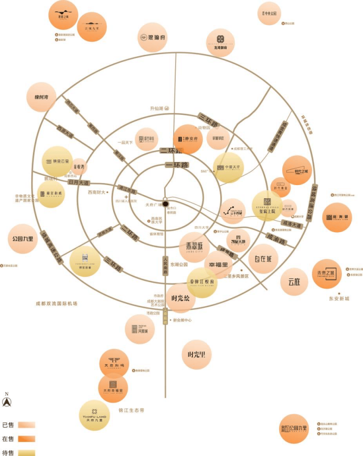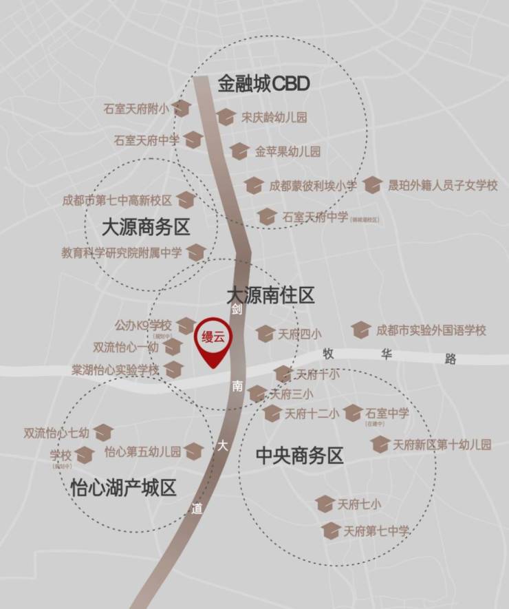 神仙树、金融城CBD、锦城湖、大源商务区、大源南住区、锦江生态带、怡心湖产城区、浅水湾等成都壕宅住区,因剑南大道而串联