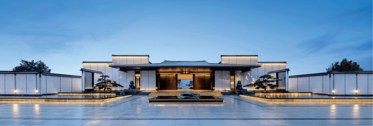 挑高飞檐、恢弘匾额、对景景墙及礼仪门楼