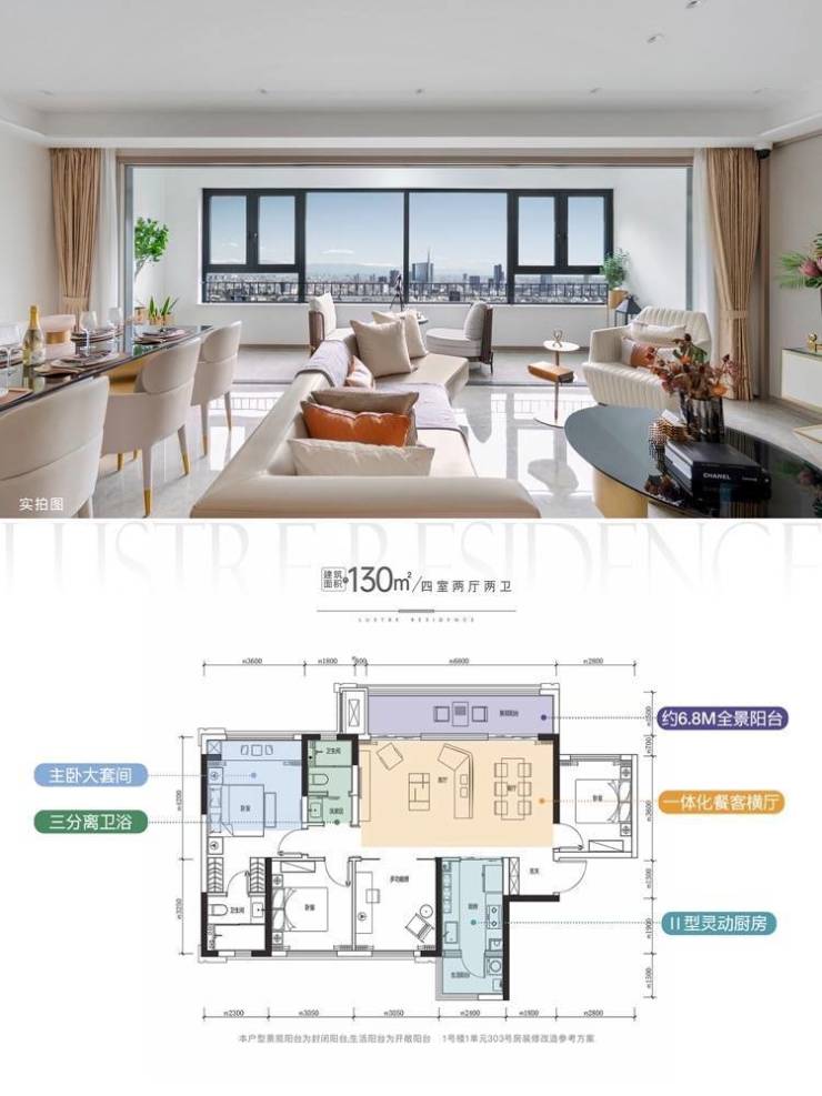 户型:130㎡舒享四房,约15.4m阔绰观景面,搭配最大约170m楼间距,坐拥环幕视野,