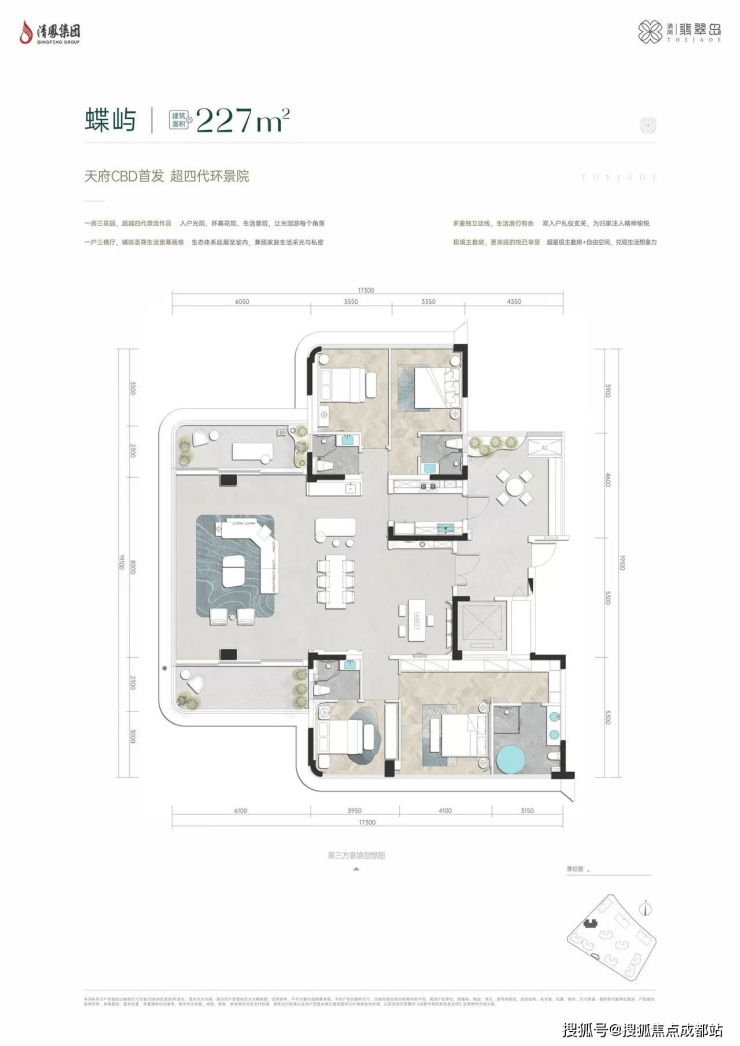 5、最强产品:约35m2U型环幕露台,270°广阔瞰景视野;约3.3-5.8米奢阔层高;3梯2户主人独梯,约2.2米超大电梯进深尺度,成都豪宅NO.1。