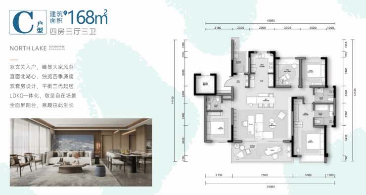 产品户型:121㎡/143㎡/168㎡(套三/套四双卫)