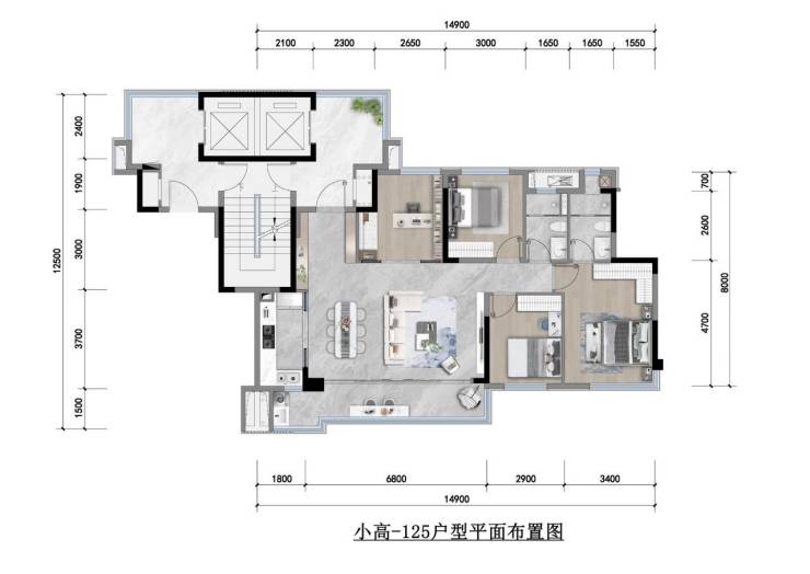 户型面积:125-143㎡阔景四居平层,190-210㎡城市叠院别墅