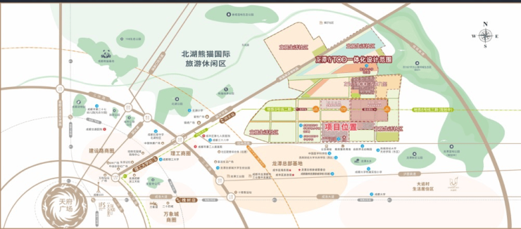 成华区东三环龙潭新城板块,为成都首个双站点TOD项目,为塑造中优、龙潭新城双战略与TOD创新结合提质典范,成都轨道城市集团整合多方优质资源,以公共交通为导向发展模式,依托地铁8号线打造3173亩双站点TOD城市大盘,品质纯板式舒居,整体营造生态、商业、办公、教育、健康、服务、人居7大生活场景,规划街区公园等生态组团、购物街&共享办公等商业核、全龄教育配套、社区医疗配套&文化馆等公共服务组团,全系生活配套约47万㎡城市级商业配套,目前各配