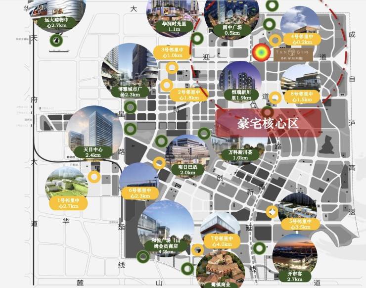 商业配套:3 公里内有西南首个万象天地 、文艺潮流 MALL 明日巴适、蓝润置地广场、远大购物中心等;7 公里内可到达金融城商圈、环球商圈,包括银泰 IN99、悠方购物中心、仁和新城购物中心、环球中心、SKP 等,满足多样化购物需求。