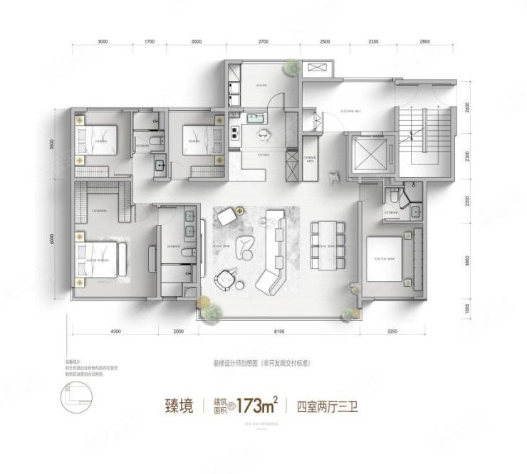 249㎡户型:一层一户配置,4室2厅4卫,南北通透。亮点包括270°环幕客厅、私人会所式空间及“三庭院”设计(空中岛院+星光花园+入户光院),适合高端社交与家庭互动。