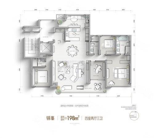 198㎡户型:新规后青羊首个200㎡级产品,LDKB一体化横厅面积达65㎡,双套房设计,搭配三个空中露台,空间利用率极高。