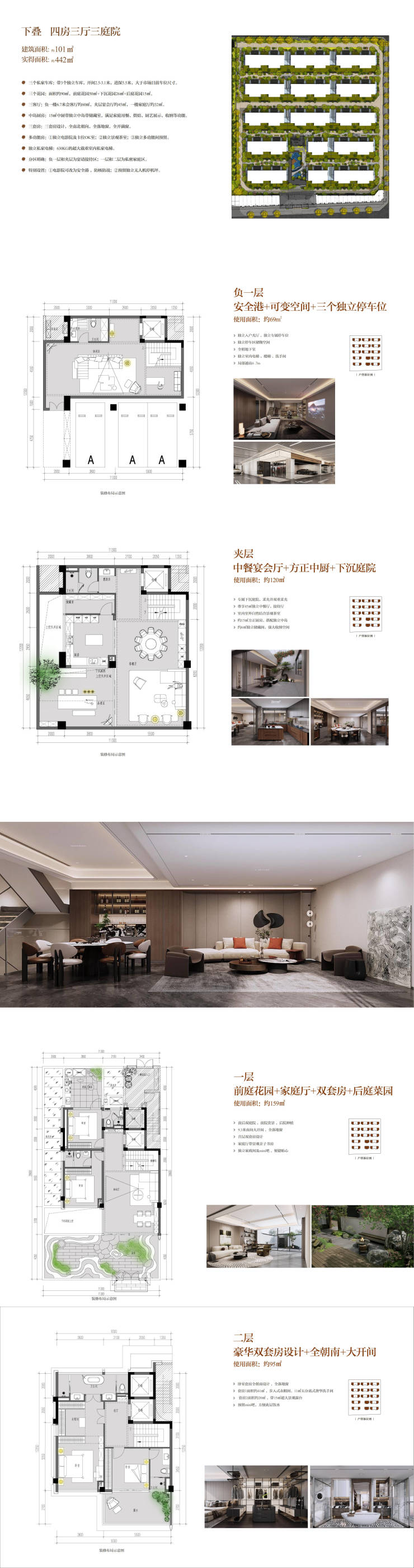 下叠(建面101㎡):实得413-442㎡,四房+三庭院+3车库,地下室层高3.2米。