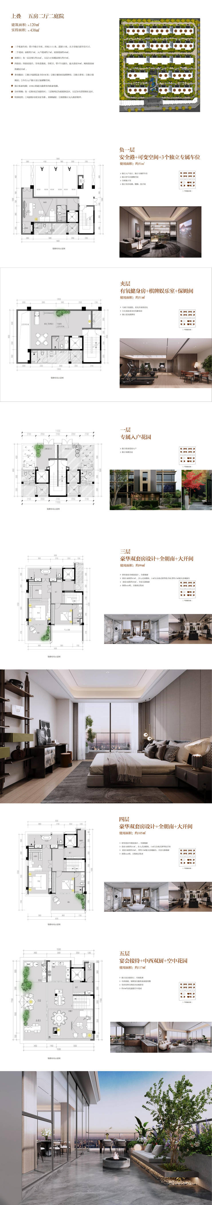 上叠(建面120㎡):实得411-438㎡,五房+双庭院+3车库,层高3.3-3.65米;
